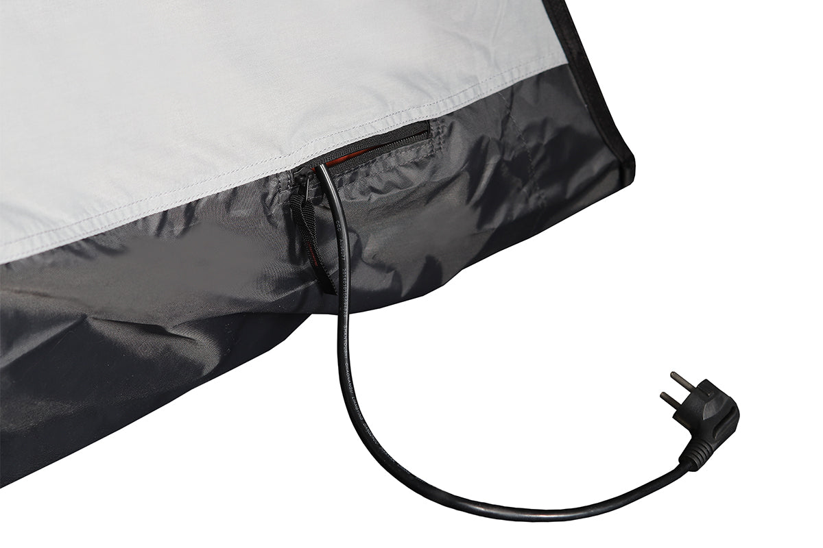 Convenient lower-corner zipper allows easy connection of equipment (e.g., heaters or lights) without compromising the seal.